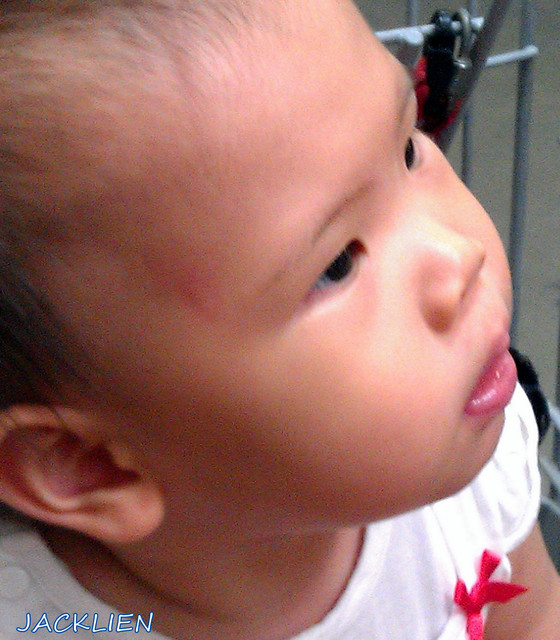 媽咪才離開一下,兔兔就摔下鹿撞到購物車…右眼尾太陽穴那裡又紅了!