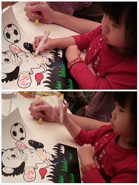 桌上有威威獅的圖畫紙,這是兔第一次拿彩色筆耶!